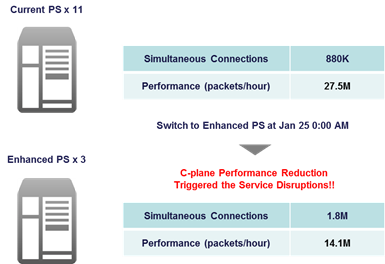 Core network nodes keep logical connections for certain periods, said Ericsson Japan CTO Mr. Fujisawa. However, physical radio links are set up and released frequently to increase radio usage efficiency. While NTT docomo had increased simultaneous connection capacity from 880K to 1.8M by introducing new packet switches to accommodate smartphone traffic, C-plane performance was reduced from 27.5M to 14.1M packets per hour (see figure below). However, before the packet switches were reinforced, sharp rises in C-plane traffic attacked NTT docomo's network.